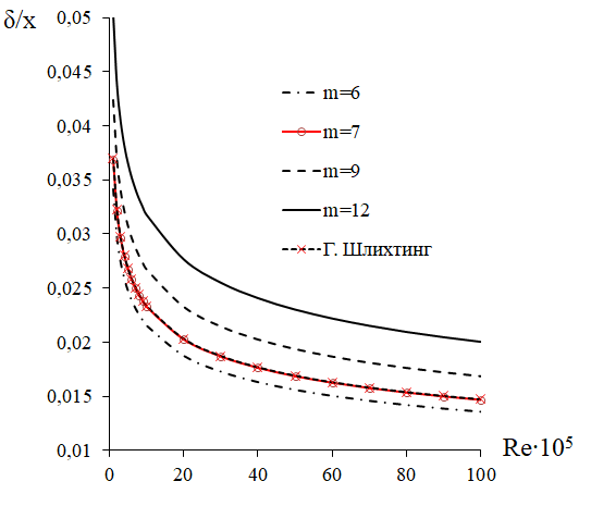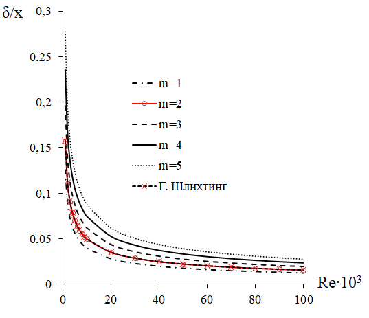 Выражение (9) определяет зависимость толщины динамического пограничного слоя в зависимости от координаты x (длины участка обтекания поверхности или элемента) и от параметра внешнего потока (критерия Re). На рис. 1 приведена графическая зависимость, определенная по выражению (9), для различных значений степеней распределения профиля динамического ламинарного пограничного слоя.