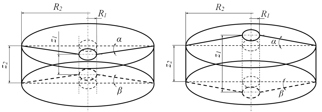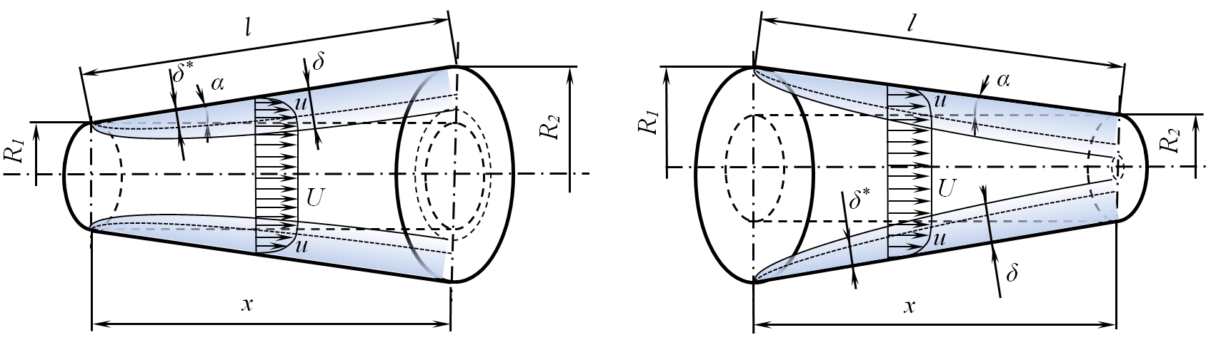 Схематически течение на начальном участке в канале цилиндрической формы переменного сечения приведено на рис. 3. Рассматривается расширяющийся и сужающийся канал. Определим условие, что угол раскрытия образующей α не приводит к отрыву потока. Отметим, что канал цилиндрической формы постоянного сечения является частным случаем рассматриваемой задачи.