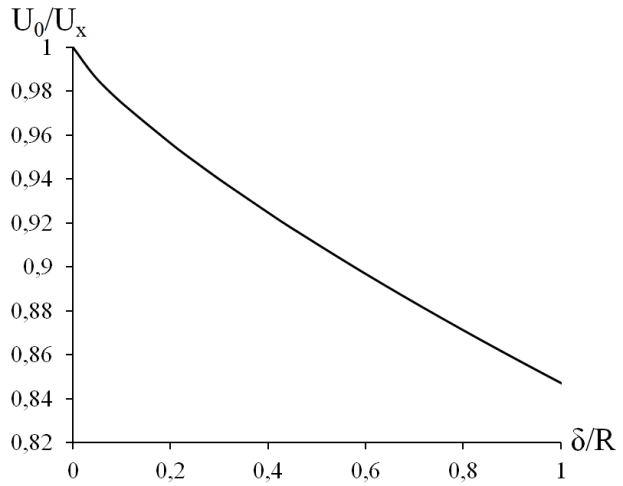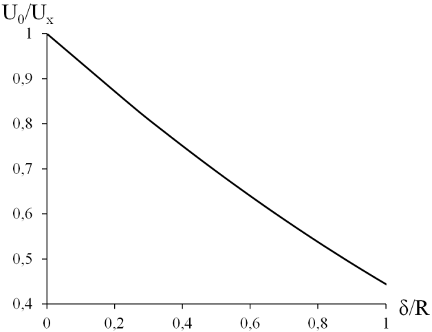 Отметим, что для канала основной характеристикой будет не толщина вытеснения, а площадь вытеснения, тогда скорость рабочего тела в ядре потока в зависимости от координаты  будет определяться, как
