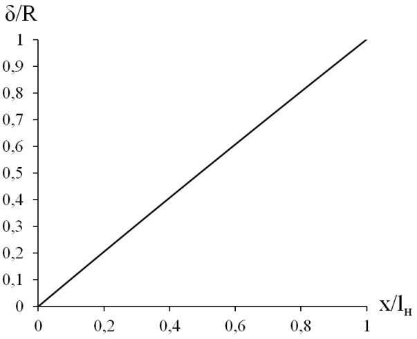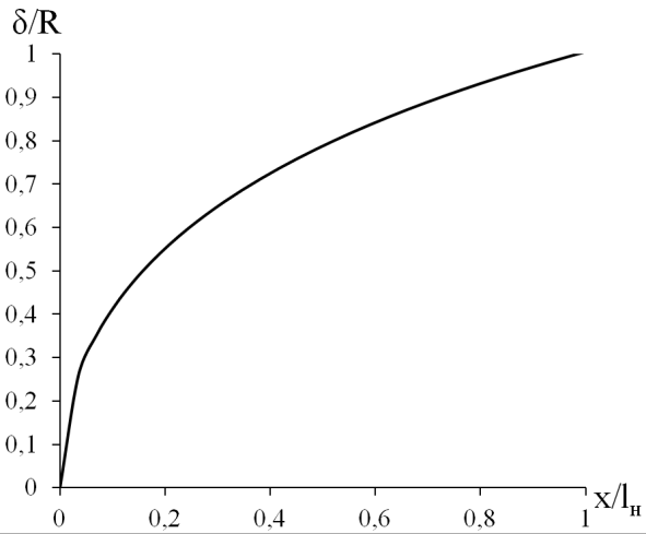 Отметим, что течение в цилиндрическом канале переменного сечения существенно отличается от течения на плоской пластине, это отличие заключается в наличии радиуса кривизны стенки, что влечет за собой существенное влияние на параметры динамического и, как следствие, температурного пограничных слоев. Отметим, что чем меньше радиус трубы, тем большее влияние будет оказано. Начальный участок развивающегося динамического слоя можно отнести к внутренней задаче, так как по длине канала происходит изменения скорости ядра потока U(x) ≠ conct. Изменение скорости ядра потока обуславливается как геометрическими особенностями канала переменного сечения, так и наличием развивающегося динамического пограничного слоя (при внешней задаче скорость ядра потока U(x) ≠ conct).