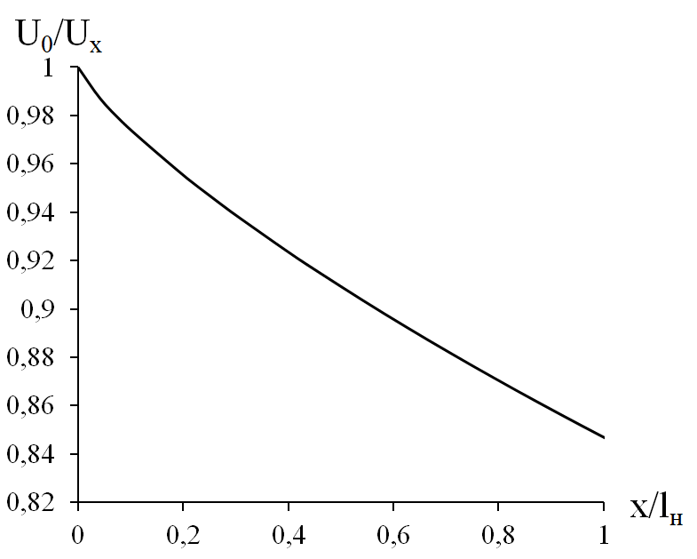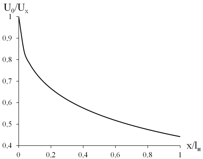 Fig. 10. Dependence of the relative flow velocity on the relative length of the initial sectionfor a laminar flow in the pipe