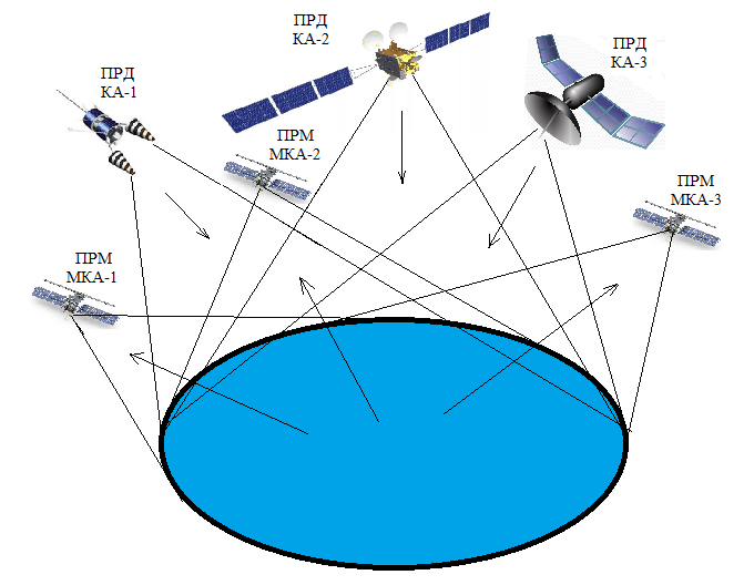 Космическая многопозиционная система должна состоять только из приемопередатчиков, расположенных на космических аппаратах различных космических систем (передатчики – космические аппараты системы связи, навигационные космические аппараты, телекоммуникационные космические аппараты и др., приемники – научно-исследовательские МКА), способных осуществлять совместную обработку от объектов, способных отражать радиосигнал. На рис. 2 представлена космическая многопозиционная система, работающая в прожекторном режиме, где функцию подсвета выполняют передатчик космического аппарата низкоорбитальной системы связи (ПРД КА-1), передатчик космического аппарата системы связи на эллиптической орбите (ПРД КА-2) и передатчик космического аппарата геостационарной системы связи (ПРД КА-3), а прием отраженного сигнала выполняет группировка или «рой» МКА (ПРМ МКА-1, ПРМ МКА-2, ПРМ МКА-3). Реализацией многопозиционной системы РСА является относительное движение радиолокаторов и рассеивающих точек в пределах необходимой облучаемой области.
