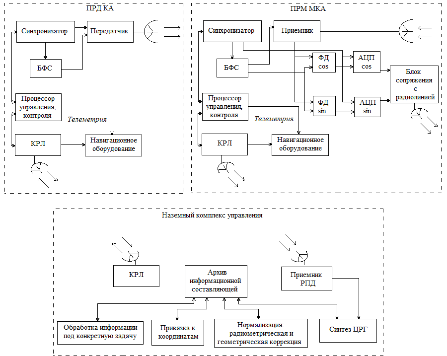 Космический радиолокационный комплекс любой космической системы включает в себя антенну, передающую на космическом аппарате подсвета (ПРД КА), и приемную антенну на МКА с РСА (ПРМ МКА), блок формирования сигналов (БФС), синхронизатор, приёмник с выходами на фазовый детектор (ФД) синусного и косинусного квадратурных каналов, аналого-цифровой преобразователь (АЦП) квадратурных каналов, блок сопряжения с радиолинией передачи данных, процессор управления и контроля, навигационное оборудование, командно-телеметрическую радиолинию (КРЛ) и радиолинию передачи данных (РПД).