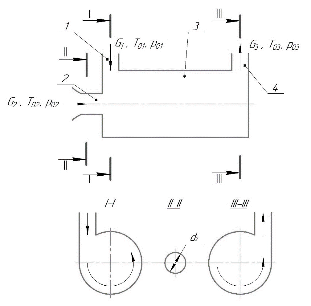 Обмен работой и теплотой приводит к снижению полного давления высоконапорного газа и к повышению полного давления низконапорного газа. На выходе из эжектора газ имеет однородное давление P03 и полную температуру T03.