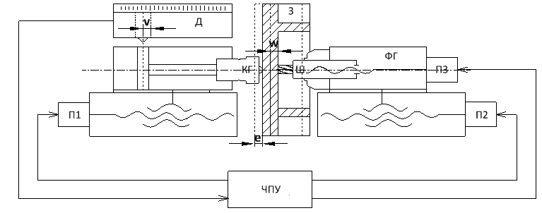 На рис. 1 представлена схема выполнения зеркального фрезерования вафельного фона на станках типа СВО. В данном случае приводы П1 и П2 осуществляют синхронное движение по управляющей программе (УП). Датчик Д, встроенный в копировальную головку КГ, отслеживает перемещение штока пневмоцилиндра; сигнал V с датчика поступает в систему числового программного управления (ЧПУ), которая корректирует положение фрезерной головки ФГ со шпинделем Ш, задавая корректирующее воздействие W приводу осевого перемещения фрезерной головки П3 в зависимости от отклонения e внутренней поверхности заготовки З с противоположной стороны.