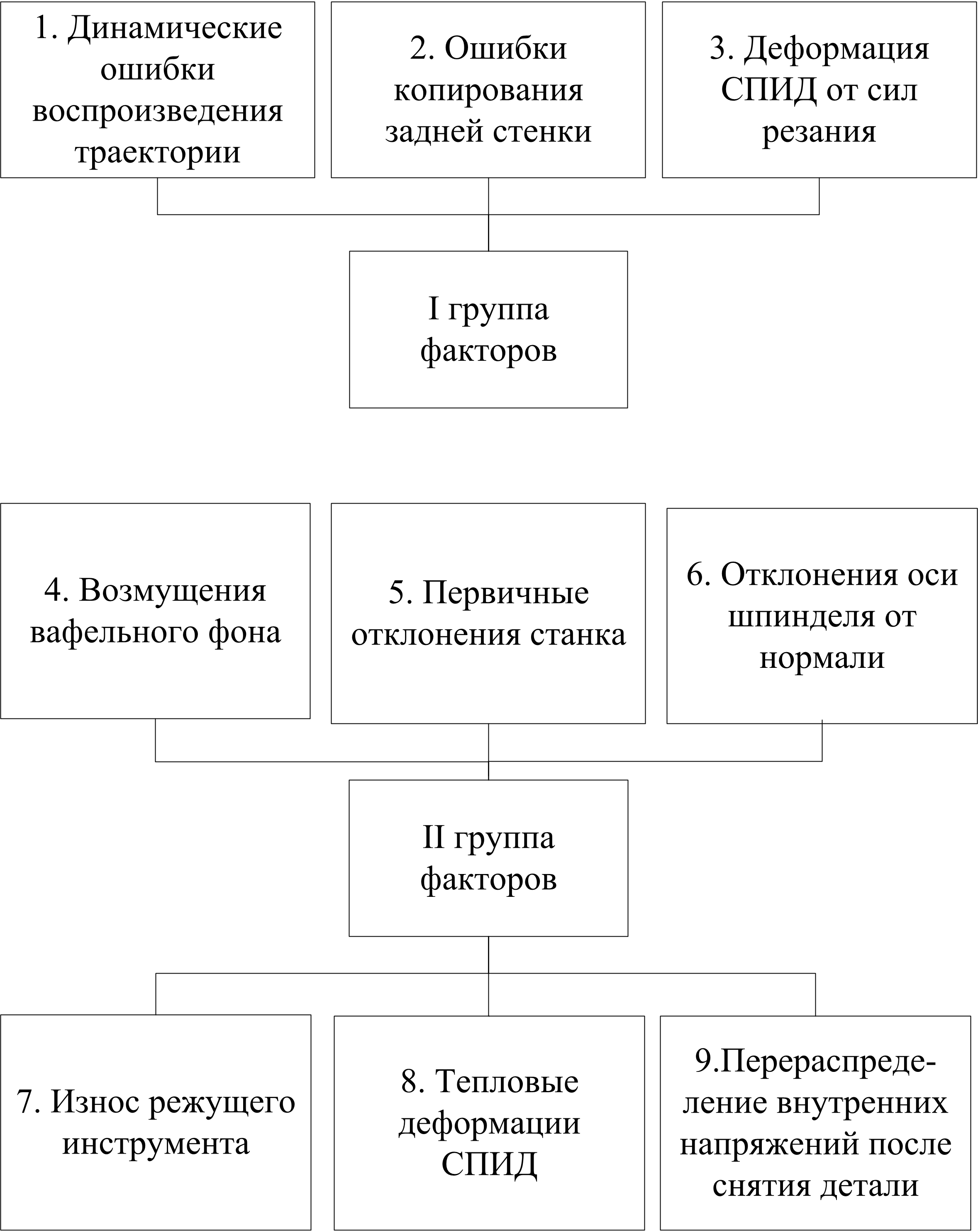 Группы факторов. При схеме обработки (рис. 1) можно выделить девять основных факторов (рис. 2), приводящих к отклонениям толщины остаточного полотна. Основными возмущениями при обработке изделия вафельного фона является: