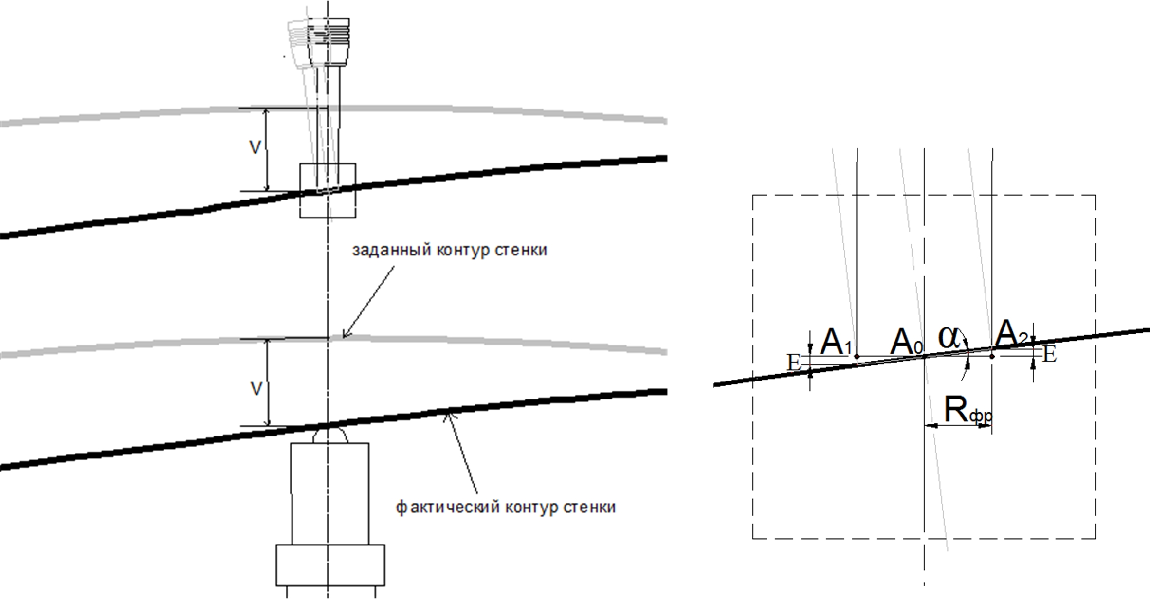 На рис. 3 приведена схема образования ошибки по толщине остаточного полотна из-за отклонения оси шпинделя от нормали к поверхности. Как видно на рисунке, положение инструмента корректируется в точке A0 на центральной оси инструмента по сигналу V с датчика слежения за контуром, который расположен соосно с фрезой.