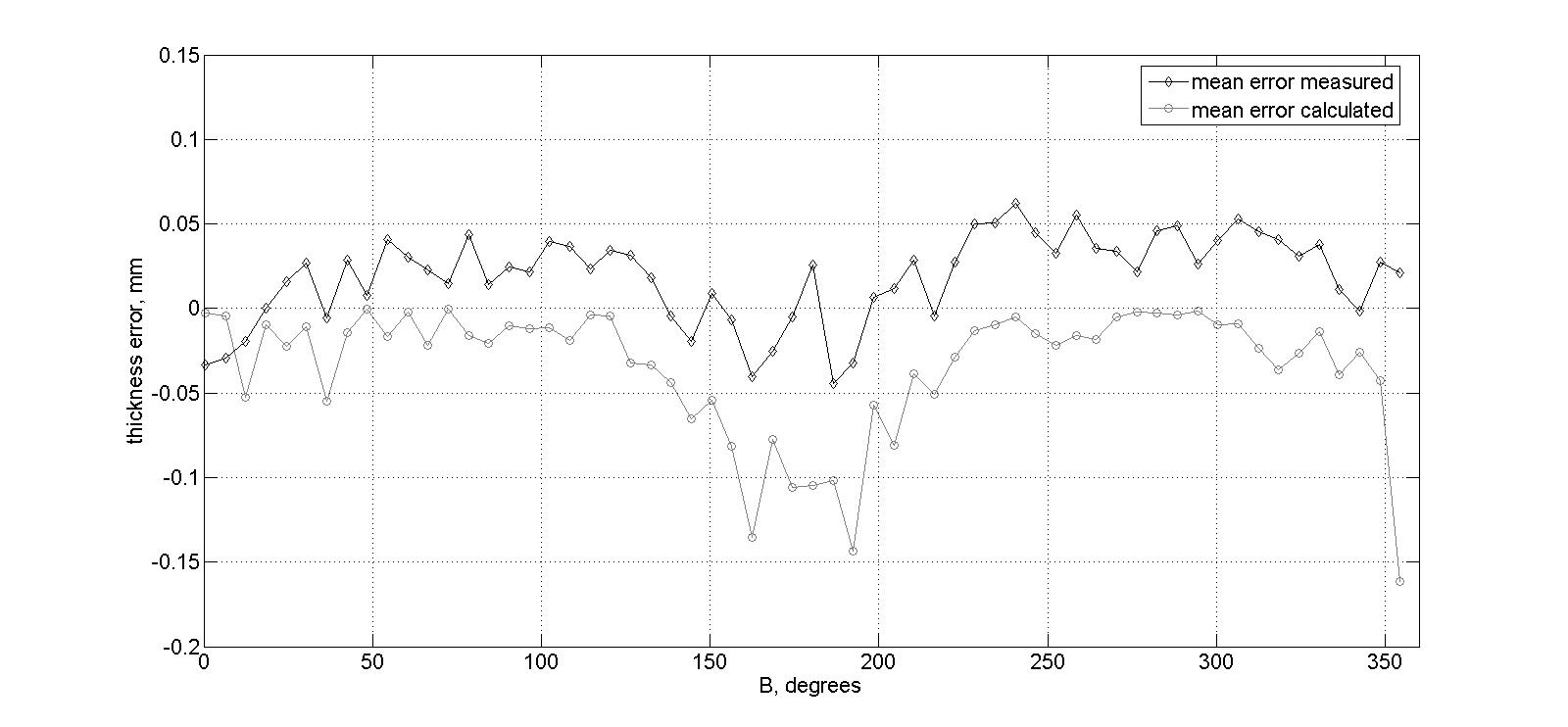 Далее по формулам (1) и (2) рассчитываются величины ошибок на каждом из участков. На рис. 4 приведены кривые ошибок по толщине остаточного полотна: черная кривая – усредненные значения измеренных ошибок, серая кривая – рассчитанные ошибки в соответствии с (1) и (2).