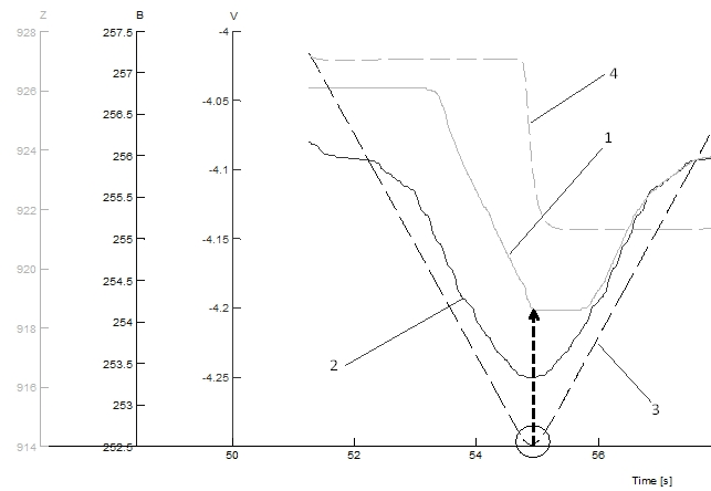 Эффект влияния ошибки копирования задней стенки заготовки на толщину остаточного полотна проиллюстрирован на рис. 5. Здесь: 1 – серая сплошная линия – сигнал V с датчика слежения за контуром, записанный при вращении поворотного стола с заготовкой по координате B в прямом и обратном направлении, 2 – черная сплошная линия – сигнал, полученный «зеркальным отражением вокруг вертикальной оси» сигнала V, записанного при предварительном измерении задней стенки ячейки без выполнения реверса, т. е. «идеальный» сигнал с датчика копирования; 3 – черная штриховая линия – сигнал энкодера поворотного стола оси B; 4 – серая штриховая линия – сигнал энкодера оси Z (вертикальное перемещение суппорта). Как видно из рис. 5, наблюдается существенное различие между «идеальным» сигналом V – кривая 2 и сигналом V – кривая 1, записанным датчиком копирования при вращении поворотного стола с реверсом по координате B. Наблюдается характерная «полочка», именно в момент реверса [21].