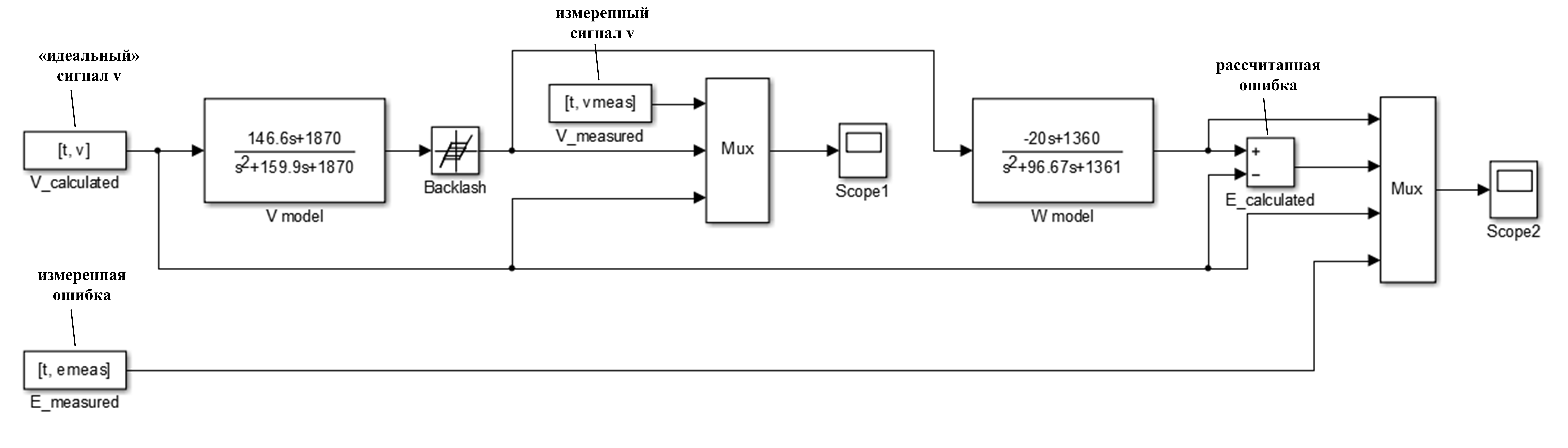 Модель включает датчик слежения за контуром (блок V model на рис. 6) с зазором Backlash и модель привода по координате W (блок W model), отрабатывающей сигнал с датчика слежения. Для моделирования зазора использован стандартный блок Backlash, который обычно применяется для моделирования геометрического зазора [21]. В данной модели «идеальный» сигнал V формируется из массива данных, полученных предварительным обмером аналогично кривой 2 (рис. 5). Сигнал подается на вход модели системы слежения – блок V_model с блоком зазора Backlash и выводится на Scope1, где сравнивается с сигналом vmeas, измеренным во время чистовой обработки ячейки по траектории «зигзаг». После чего данный сигнал подается на вход модели привода, блок W_model; полученный на выходе сигнал используется для вычисления расчетной ошибки E_calculated как разницы между сигналом V, полученным предварительным обмером и фактическим сигналом W, на выходе системы с зазором. Расчетная ошибка вместе с измеренной ошибкой E_measured выводится на Scope2.