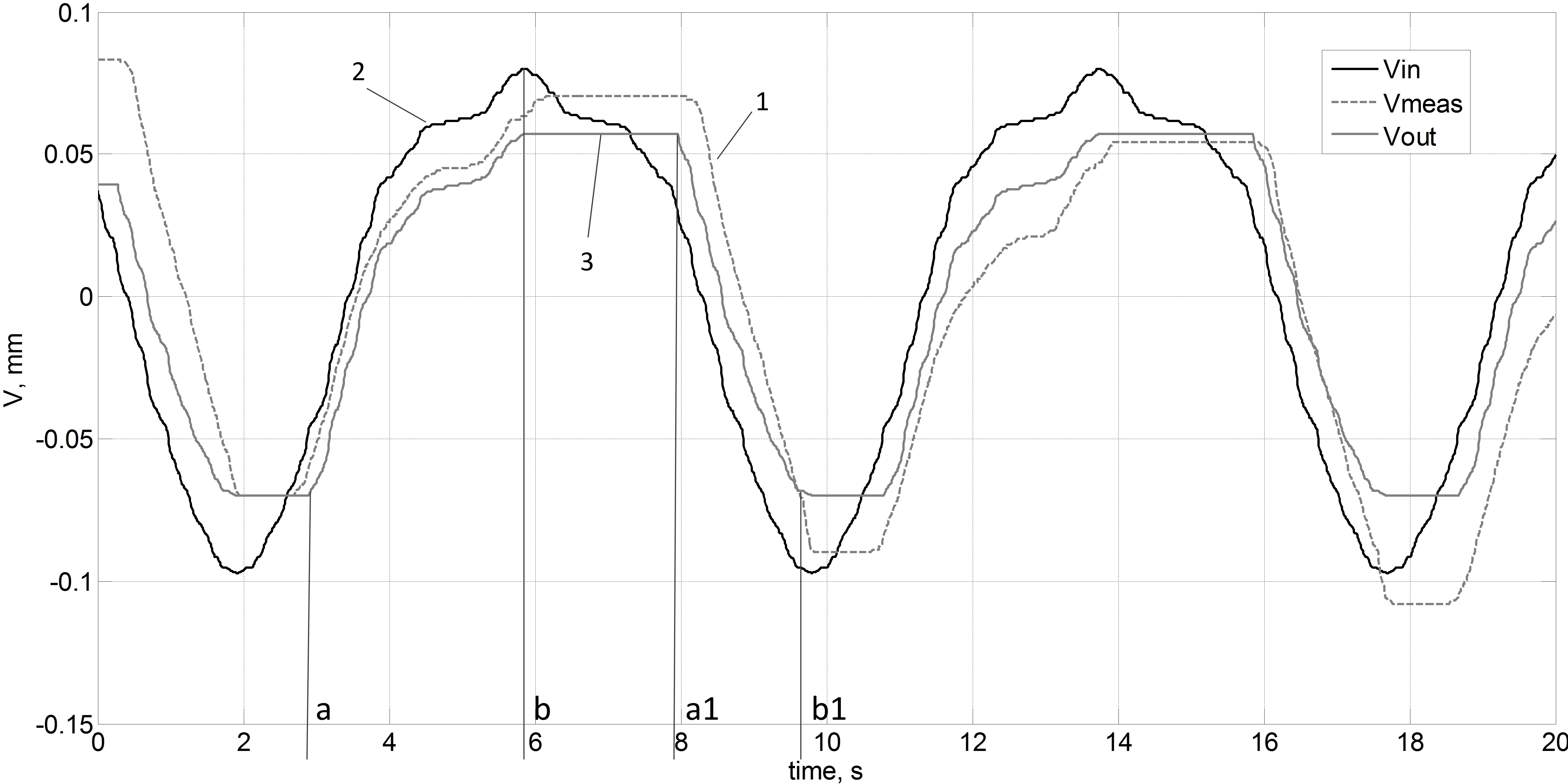 На рис. 7 приведены сигналы со Scope1 при моделировании прохода по одной ячейке. Здесь 1 – серая штриховая линия – фактический измеренный сигнал копирования V во время обработки, 2 – черная сплошная линия – рассчитанный «идеальный» сигнал с датчика слежения за контуром (рассчитывается на основе данных о кривизне кармана до обработки), 3 – серая сплошная линия – сигнал V, полученный моделированием («упругого» зазора) при обработке кармана по траектории «зигзаг».