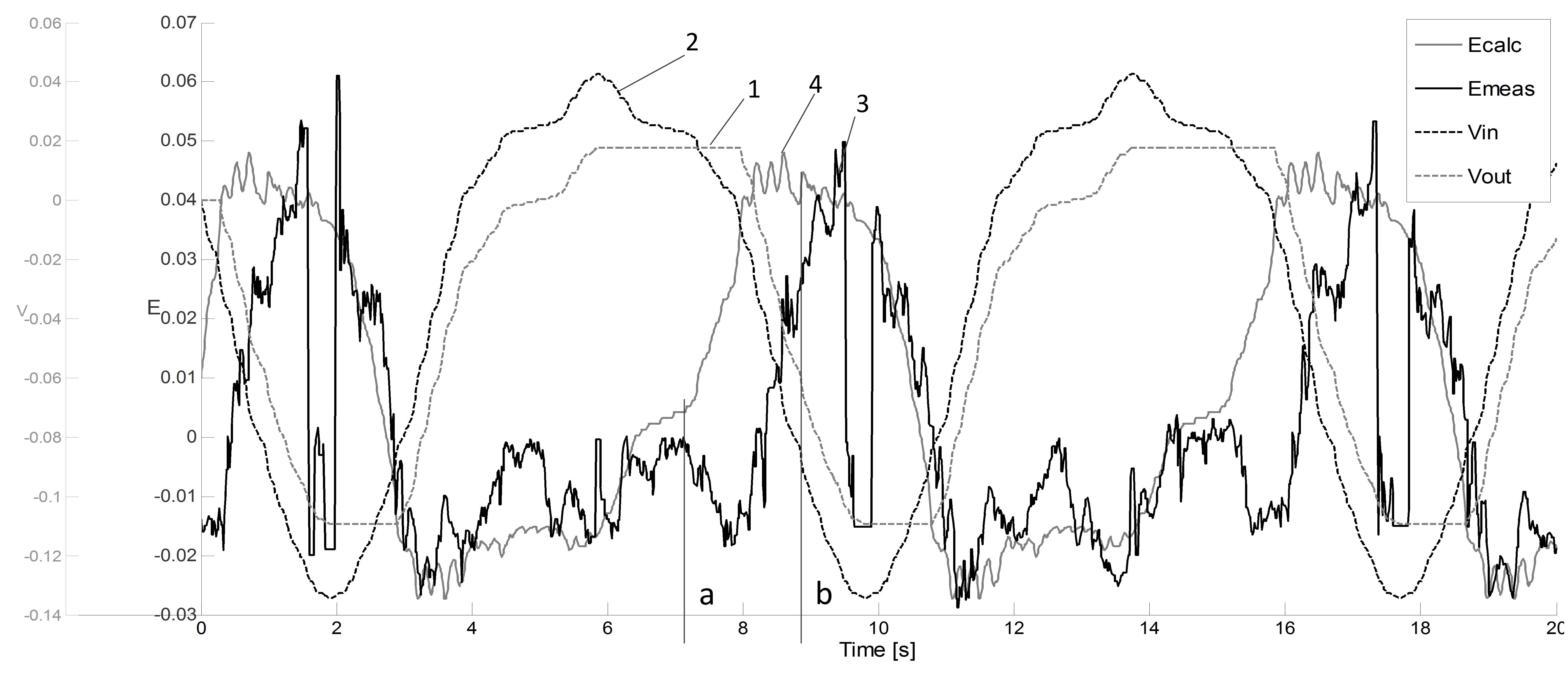На рис. 8 приведены сигналы со Scope2 при моделировании образования отклонения толщины остаточного полотна при проходе по одной ячейке. Здесь 1 – серая штриховая линия – полученный на модели привода сигнал W перемещения инструмента вдоль оси шпинделя во время обработки кармана по траектории «зигзаг», 2 – черная штриховая линия – рассчитанный «идеальный» сигнал с датчика слежения за контуром (рассчитывается на основе данных о кривизне кармана до обработки), 3 – черная сплошная линия – измеренная ошибка по толщине остаточного полотна, 4 – серая сплошная линия – рассчитанная ошибка по толщине остаточного полотна. Расчётная кривая 4 есть «разность» кривых 1 и 2 и, в целом, хорошо согласуются с кривой 3 за исключением участка ab (возможно, за счет неточности согласования точек отсчёта сигналов измерения и моделирования).