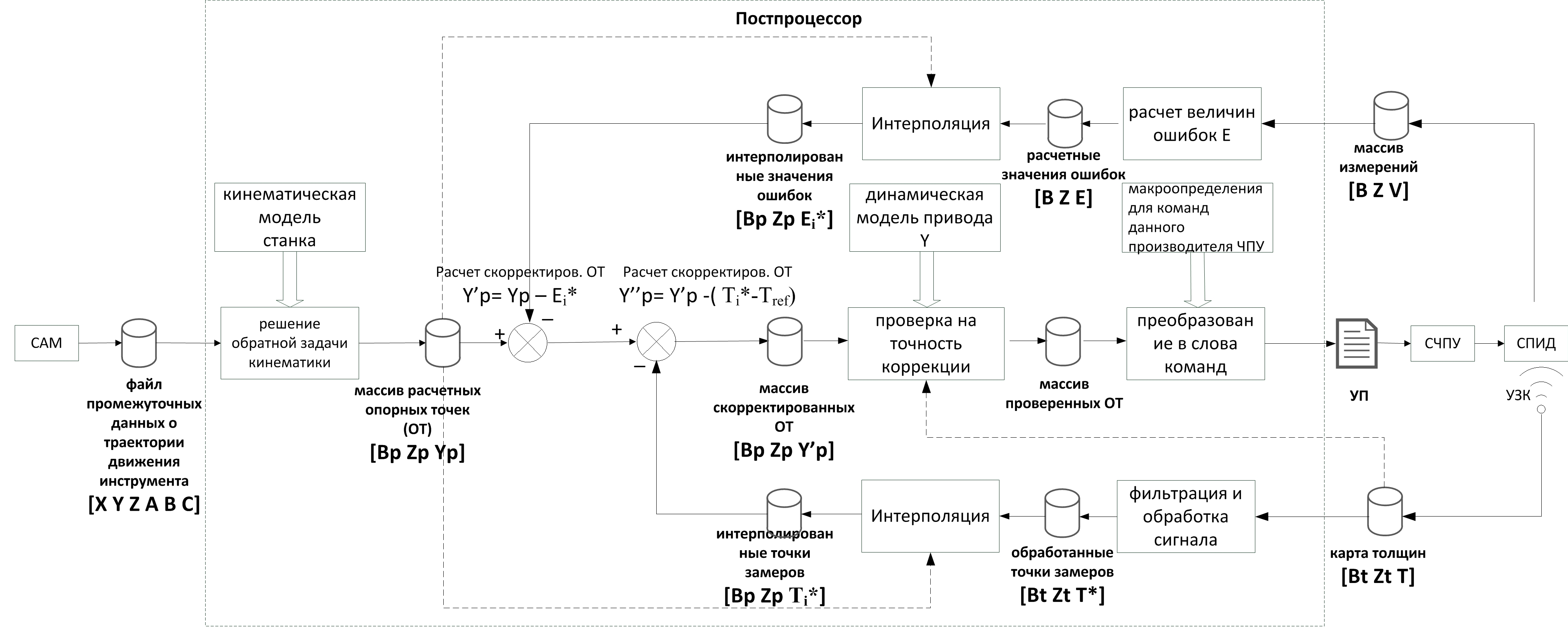 - массив опорных точек траектории обработки [Bp Zp Yp…], рассчитанный в постпроцессоре на основе заданных в CAM-системе траектории движения инструмента и режимов резания с учетом кинематической модели станка.
