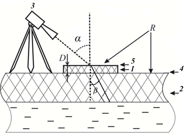 Fig. 1. Scheme for measuring the loss factor of artificial icing field on the surface of the ice cover: D is the icing field thickness; α is the observation angle equal to the angle of refraction; β is the angle of incidence of thermal radiation from ice onto the ice – air boundary