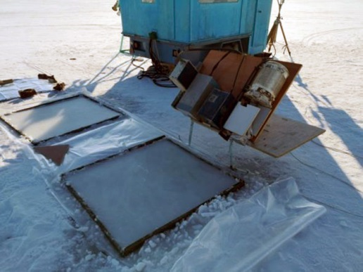 Измерения выполнены на частотах 22, 34, 94, 125 ГГц на наледи с плоскими границами и площадью поверхности 1 м2. При этом минерализация верхнего слоя ледяного покрова озера составляла значение порядка 10 мг/к Четыре радиометра с флуктуационной чувствительностью 0,05 К при постоянной времени 4 с размещали на передвижной платформе, которую последовательно передвигали между участками с наледью, ледяным покровом без снега и металлическим листом. Для калибровки радиометров использовали открытую водную поверхность проруби и отраженное излучение неба от металлического листа, площади и размеры которых соответствовали наледи. Измерения были выполнены при безоблачной атмосфере. В этой схеме проводили сравнение радиояркостной температуры наледи (ТН), образованной на поверхности ледяного покрова (т. е. суммарного излучения слоя наледи и ледяного покрова на воде) и очищенного от снега ледяного покрова (ТЛ). Отметим, что снежный покров перед образованием наледи был тщательно удален, а поверхность льда выравнена от шероховатостей. Фотография установки показана на рис. 2.