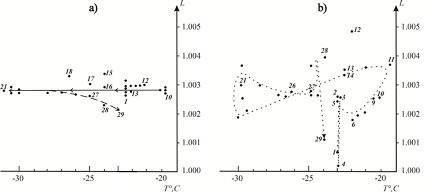 Для объяснения сильного рассеяния на частотах 90–125 ГГц высказано предположение, что рассеяние возникает на мелких кристалликах кристаллогидратов из солей, имеющихся в исходной воде [13] наледи. То, что образование кристаллогидратов приводит к рассеянию, следует из рис. 3, где вблизи температуры эвтектики хлорида натрия (–21…–22 °С) наблюдали уменьшение L. Предполагаемый конкретный механизм этого эффекта следующий. При понижении температуры ниже точки эвтектики в среде из жидкой воды возникает переходная фаза от переохлажденной воды ко льду Ih, названная льдом 0 [14]. Для наноразмерных кристаллов льда0 температуры его образования оказываются ниже –23 °С. Это значение может варьироваться в некоторых пределах в зависимости от объема и геометрии мерзлого образования. То же для процесса нагревания такого льда, когда выше точки фазового перехода он превращается в лед Ih.