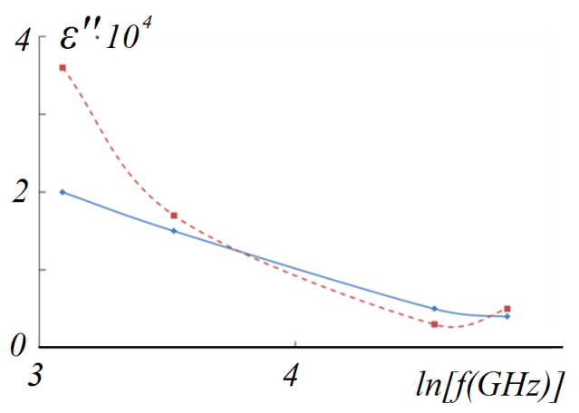 При постановке экспериментов использовали представление о том, что затухание радиотеплового излучения определяется потерями в среде. Однако во многих случаях требуется учет рассеяния излучения на внутренних неоднородностях объекта [2]. Зависимость ε″ от частоты (рис. 4) показывают уменьшение этой величины по мере возрастания частоты. Расчеты по формулам работ [6; 12] дали значение фактора потерь для чистого льда приблизительно в 3 раза выше на частоте 22 ГГц, в 10 раз выше для 34 ГГц и в 20…100 раз выше на частотах 90–125 ГГц, т. е. ε″ однородного льда возрастает с частотой. Кроме того, следует учитывать, что лед наледи исследуемого озера приблизительно на порядок больше содержит солевых включений, поэтому в природной среде ожидается еще более высокое значение ε″. Однако оно будет проявляться при температурах выше –21,4 °С (температура эвтектики хлорида натрия) – основного солевого компонента воды озера, когда включения солей присутствуют в виде жидких капсул и пленок между кристаллитами. В случае образования кристаллогидратов считается, что потери среды близки случаю чистого льда.