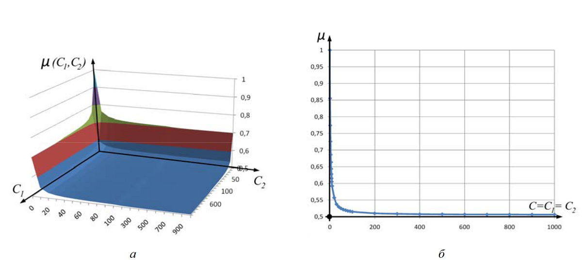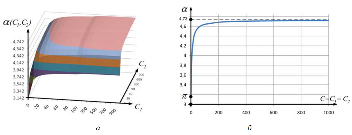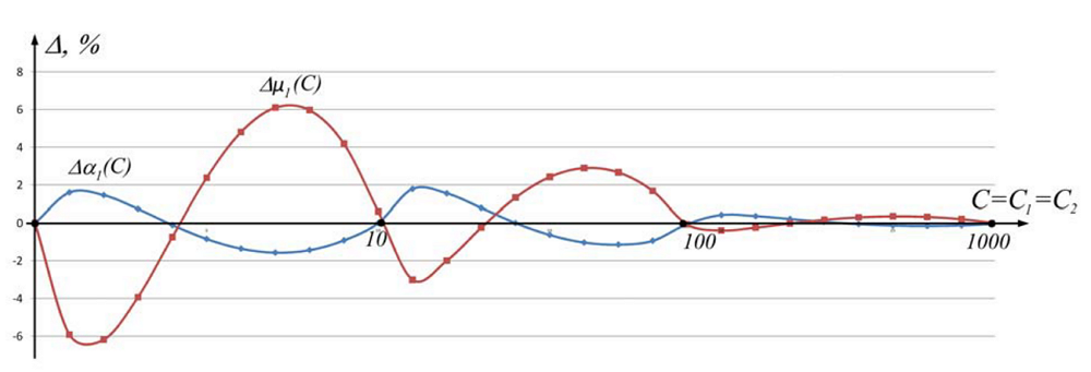 При разнице в жесткостях опор более чем в 10 раз погрешность увеличивается до 15 %, что может потребовать несколько итераций при определении требуемого значения коэффициента опор. Также следует отметить, что из-за высокой нелинейности функций a1(С1, С2) и µ1(С1, С2) результат решения обратной задачи (24), (26) напрямую зависит от точности входных данных.