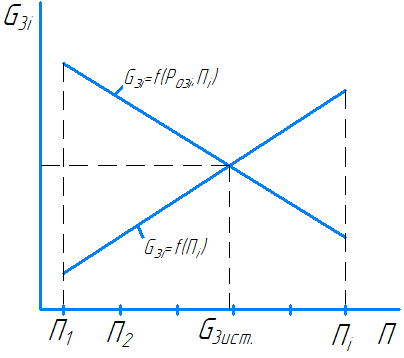 Рис. 1. График изменения расхода газа на выходе из вихревого эжектора в зависимости от степени эжекции Пi и в функции от (P03, Пi)