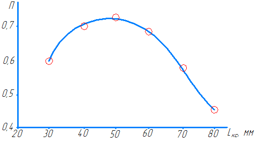 Рис. 4. Влияние длины камеры смешения на коэффициент эжекции (▬ – расчет; ◯ – эксперимент)
