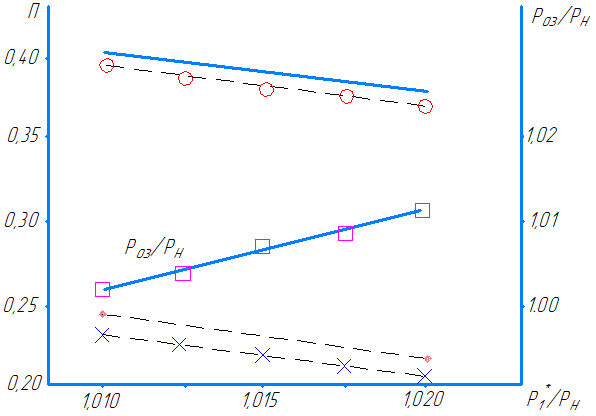 Точка пересечения двух графиков дает истинное значение степени эжекции и полного давления газа на выходе из вихревого эжектора.