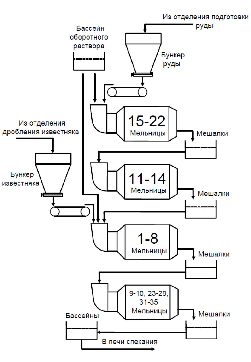 Из схем проточного усреднения шихта перекачивается в расходные бассейны, откуда насосами подается на печи спекания. Избыток шихты по кольцевым трубопроводам возвращается в расходные бассейны.
