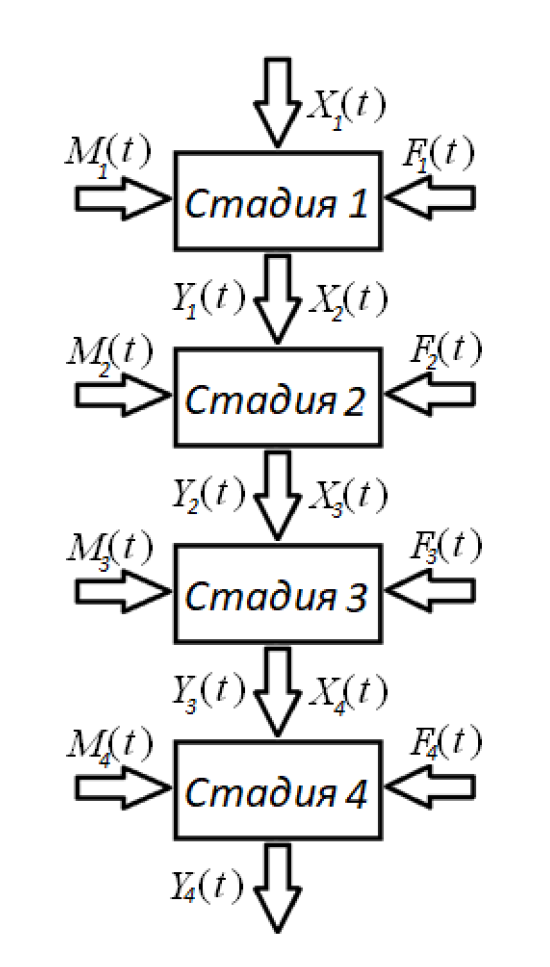 На рис. 2 изображен каскад мельниц как объект автоматизации, где X(t) – вектор управляющих воздействий; F(t) и M(t) – векторы контролируемых и неконтролируемых возмущений, соответственно; Y(t) – вектор выходных параметров. Таблица содержит векторные переменные каскада мельниц.