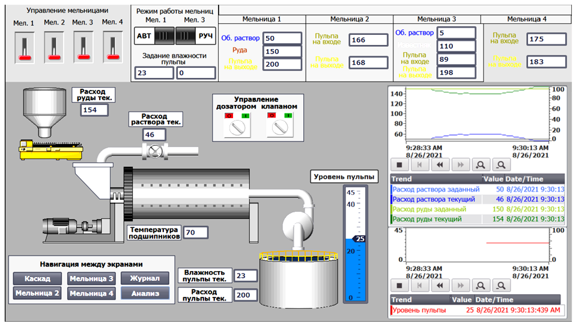 В левой части экрана «Мельница 1» показана мельница, бункер руды, конвейер, трубопровод с раствором, мешалка и насос на выходе из мельницы. Также здесь расположены текущие показания датчиков. В нижней части расположена навигационная панель. Справа находятся тренды, на которых показаны расходы материалов текущий и заданный, а также тренд уровня пульпы в мешалке.