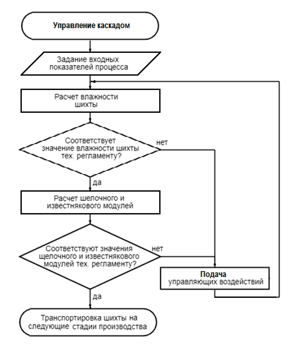 Управление каскадом мельниц осуществляется в несколько этапов, которые во время работы могут повторяться. На рис. 4 отображена очередность работы блоков программы управления. Входные показатели на блок-схеме включают в себя управляющие воздействия и состав сырья.
