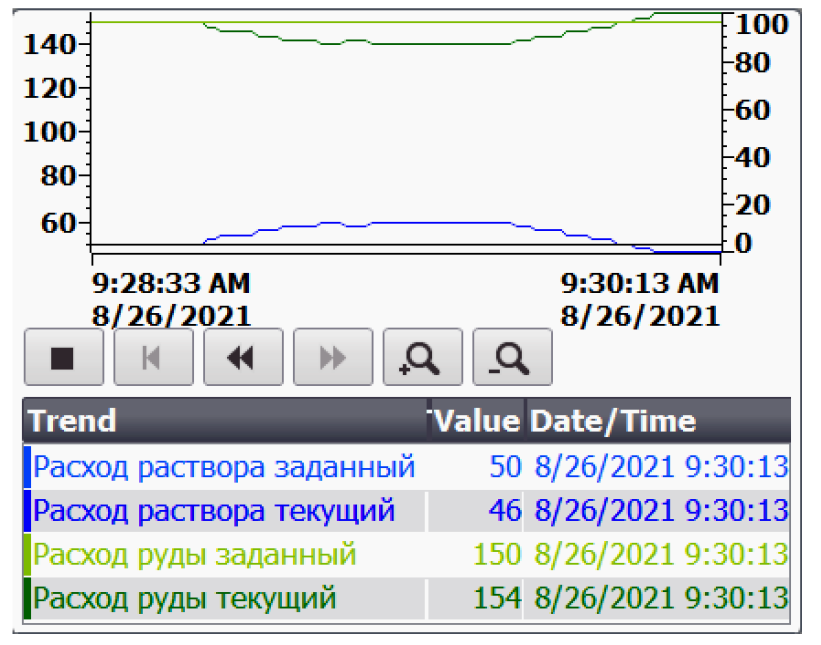 Автоматический режим работы мельницы предполагает, что отклонение значения текущей влажности от заданного будет приводить к изменению значений расхода материалов, поступающих в мельницу. Например, если значение текущей влажности меньше заданного, необходимо повысить расход раствора, но при этом снизить расход руды, чтобы общая производительность мельницы не изменилась. Ниже на панели трендов показан такой случай (рис. 5) [15].