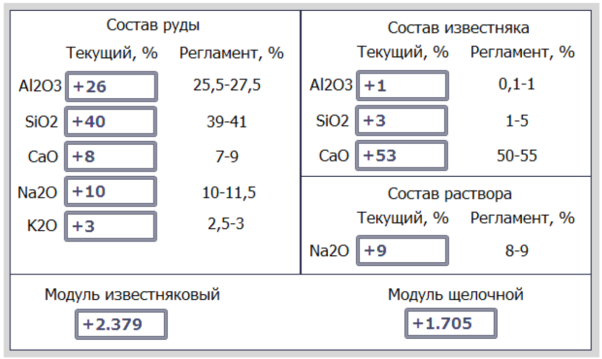 На рис. 6 показана панель задания состава сырья и расчета модулей. Перейти к ней можно через навигационную панель – вкладка «Анализ». Для имитации работы лабораторных анализаторов была разработана программа расчета щелочного и известнякового модулей на языке FBD. Благодаря программе, можно изменить состав сырья и увидеть изменение значения модулей в реальном времени. Известняковый и щелочной модули вычисляются на основе расчетных формул согласно технологическому регламенту, описанному выше.