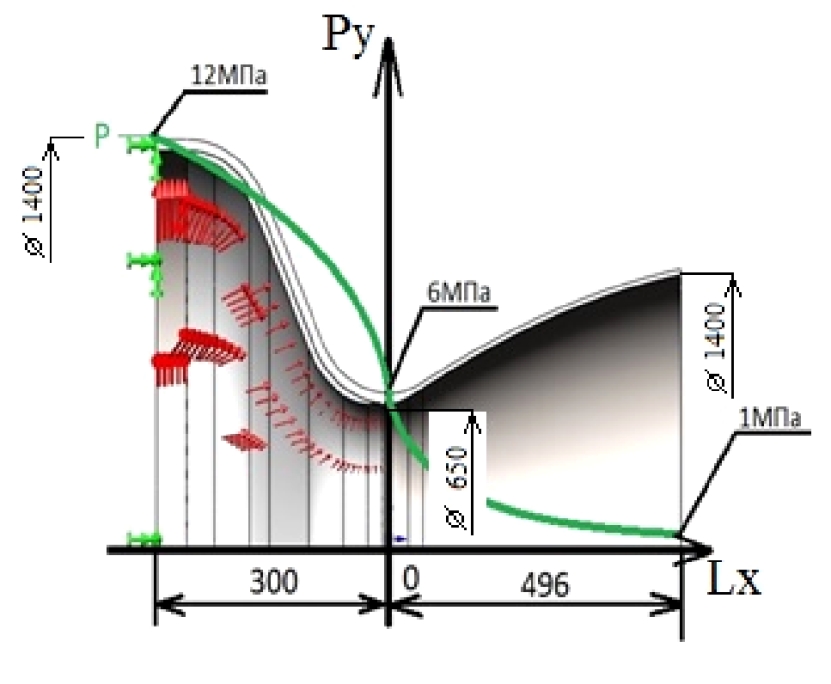 Using equation (2), we apply loads to the nozzle. Load distribution and boundary conditions for the calculation model are shown in Fig. 4, where green (outer) arrows indicate fastenings, red (inner) arrows indicate applied loads.