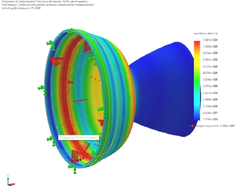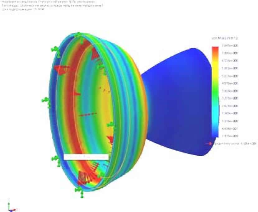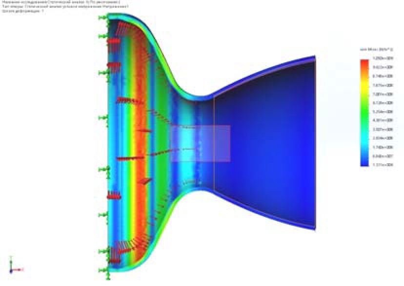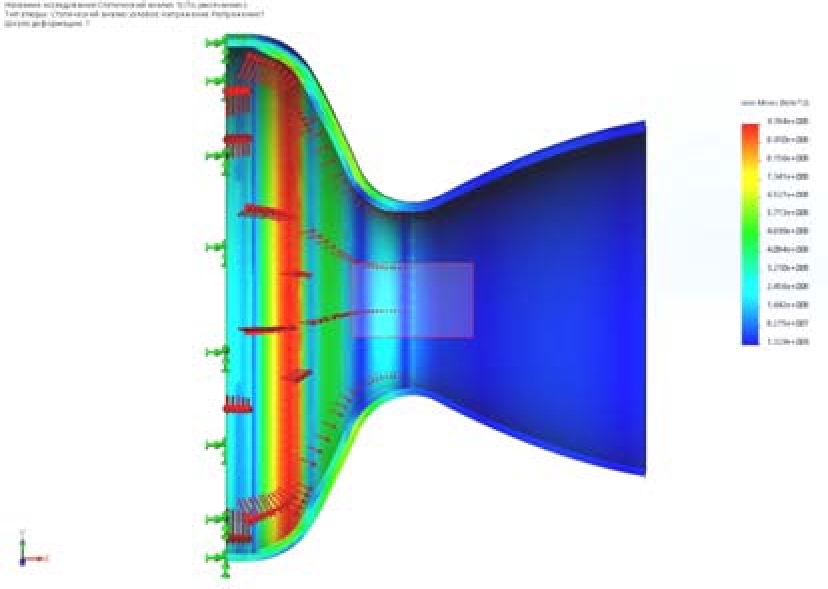 The maximum stresses in a nozzle with a thickness of 15 mm are 2.32*10^9N/m^2 (Fig. 5), which exceeds the yield limit of the selected titanium alloy and does not provide the load-bearing capacity of the nozzle. For a nozzle with a wall thickness of 30 mm, the stresses were 7.841*10^8 N/m^2 (Fig. 6), which provides the necessary safety margin.
