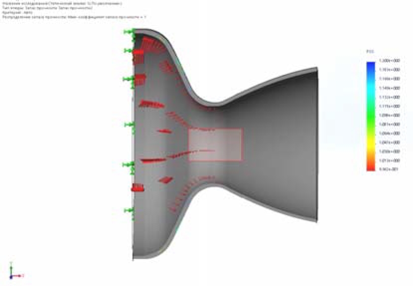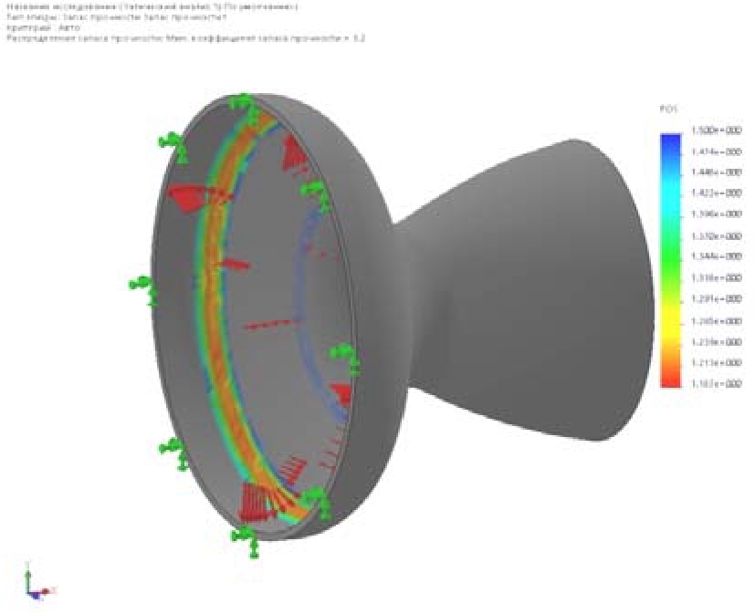 Рис. 8. Коэффициент запаса прочности в сопле t = 30 мм