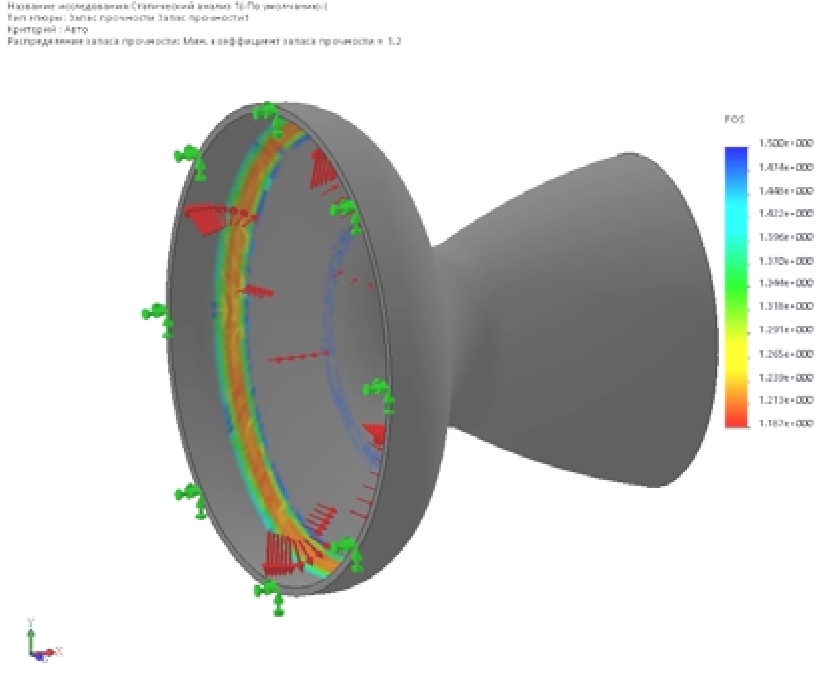 Рис. 7. Коэффициент запаса прочности в сопле t = 15 мм