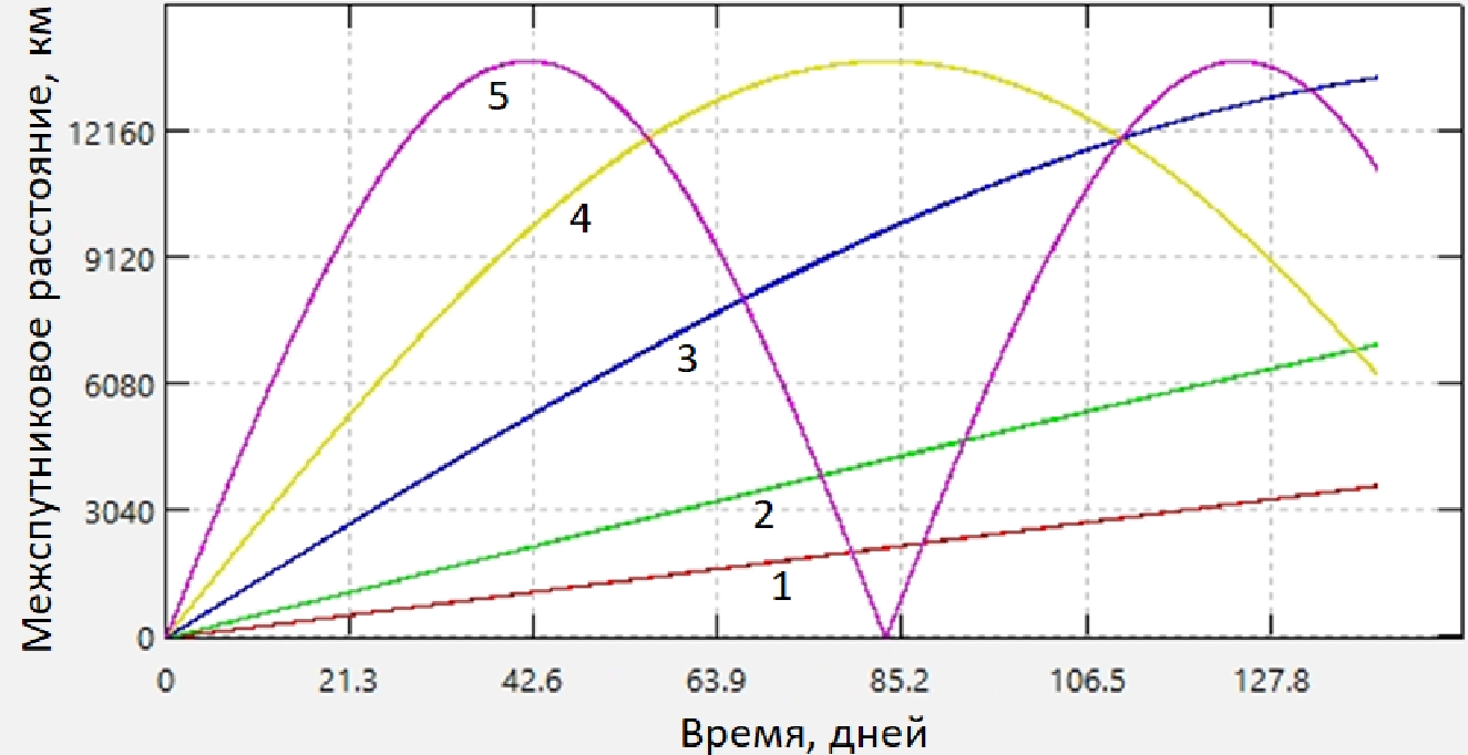 Рис. 5. Межспутниковое расстояние свободно ориентированных спутников за 140 дней с начальной разностью скорости: 1 – 0,1 м/с; 2 – 0,2 м/с; 3 – 0,5 м/с; 4 – 1 м/с; 5 – 2 м/с
