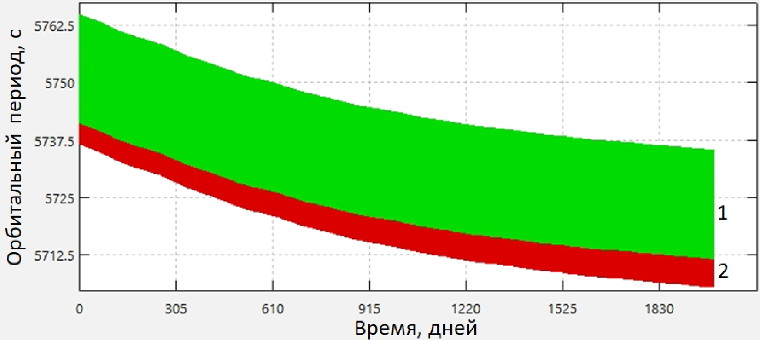 Fig. 8. Orbital periods of satellites under the influence of aerodynamic control: 1 – for a satellite with a higher initial velocity; 2 – for a satellite with a lower initial velocity