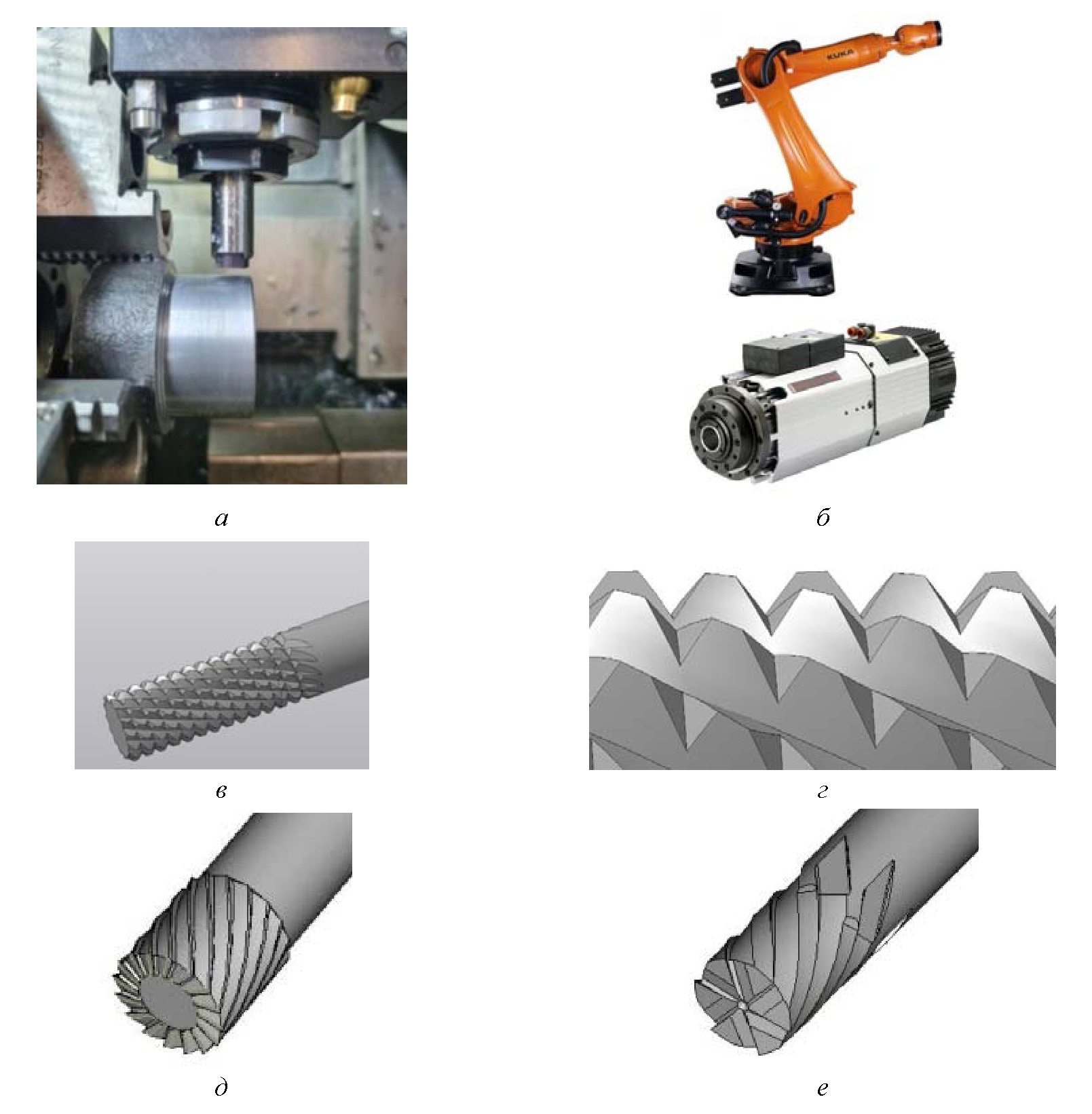 Рис. 1. Оборудование и оснастка для проведения экспериментов: а – токарно-фрезерный станок с ЧПУ DMG MORI CTX 310; б – робот Kuka KR 90 R3100 extra HA (Япония) и шпиндель H6161H0902; в, г – 3D-модель новой конструкции многолезвийной фрезы-роутера EMC-D10-90-1 и профиль зубьев; д, е – геометрия режущей части концевых фрез для обработки алюминиевых сплавов