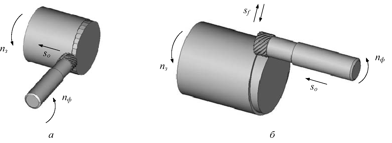 When processing a part using the milling method, the tool makes two movements: progressive motion along the axis of the part (so) and rotational motion around its own axis (nc); and the workpiece being processed rotates around its own axis (nд). It is possible to have both a perpendicular position (Fig. 3, a) of the cutter rotation axis relative to the workpiece rotation axis, and a coaxial position (Fig.