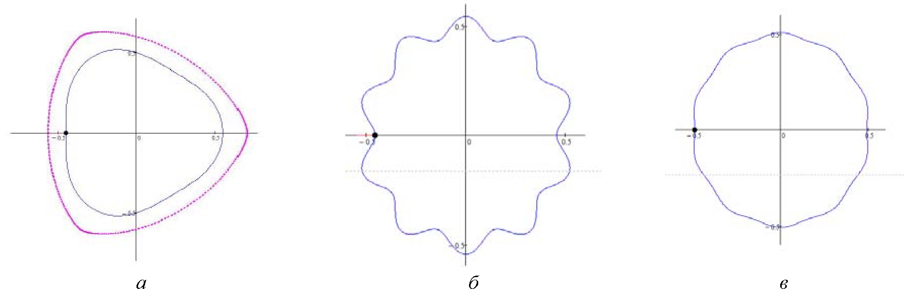 Рис. 5. Результаты моделирования профилей поверхностей деталей: а – профиль треугольника Рело; б – циклоида; в – многогранник