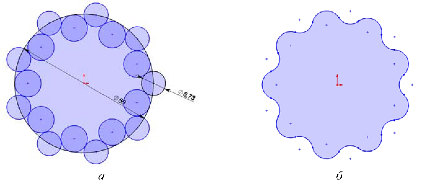 Рис. 6. Построение контура цевочного колеса: а – массив промежуточных окружностей; б – профиль детали