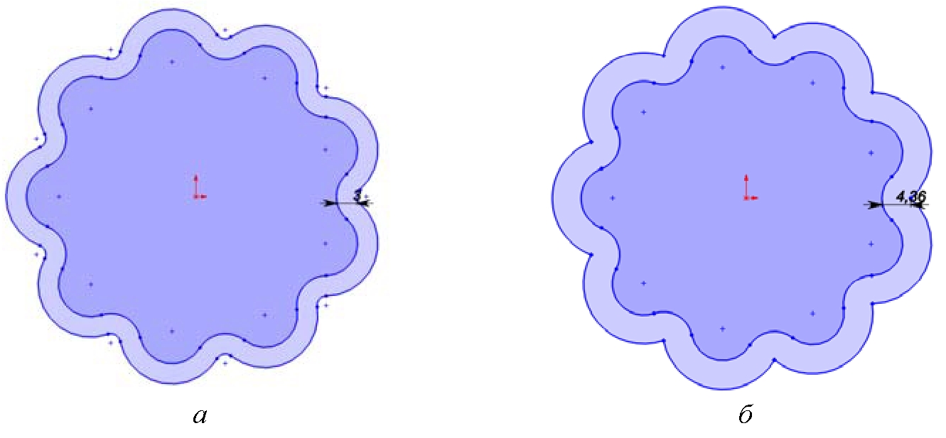 To obtain the trajectory of the cutter, it is necessary to perform the “object displacement” operation. The amount of displacement should be equal to the radius of the cutter, and the trajectory is a closed contour of arcs of two different radii (Fig. 7, a). If the diameter of the cutter is equal to the diameter of the pin, the trajectory will consist of arcs of the same radius (Fig. 7, b).
