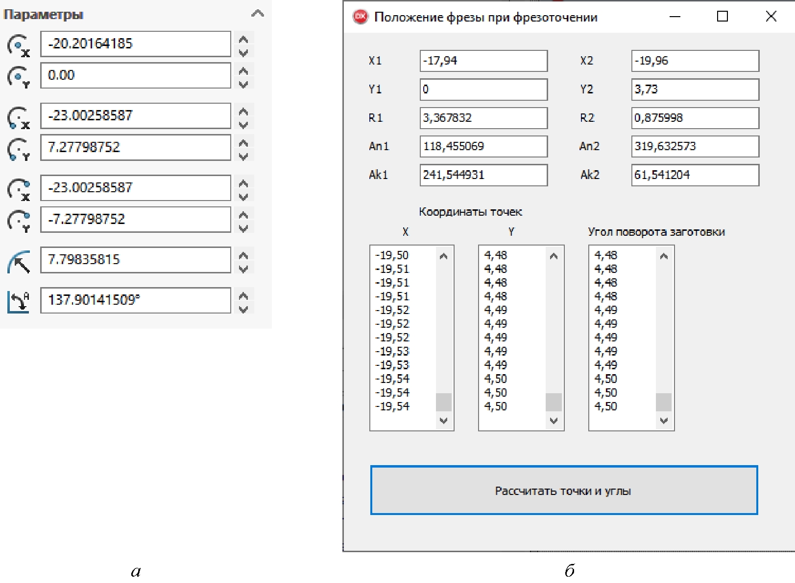 Рис. 8. Получение характеристик дуги в SolidWorks (а) и интерфейс приложения (б)