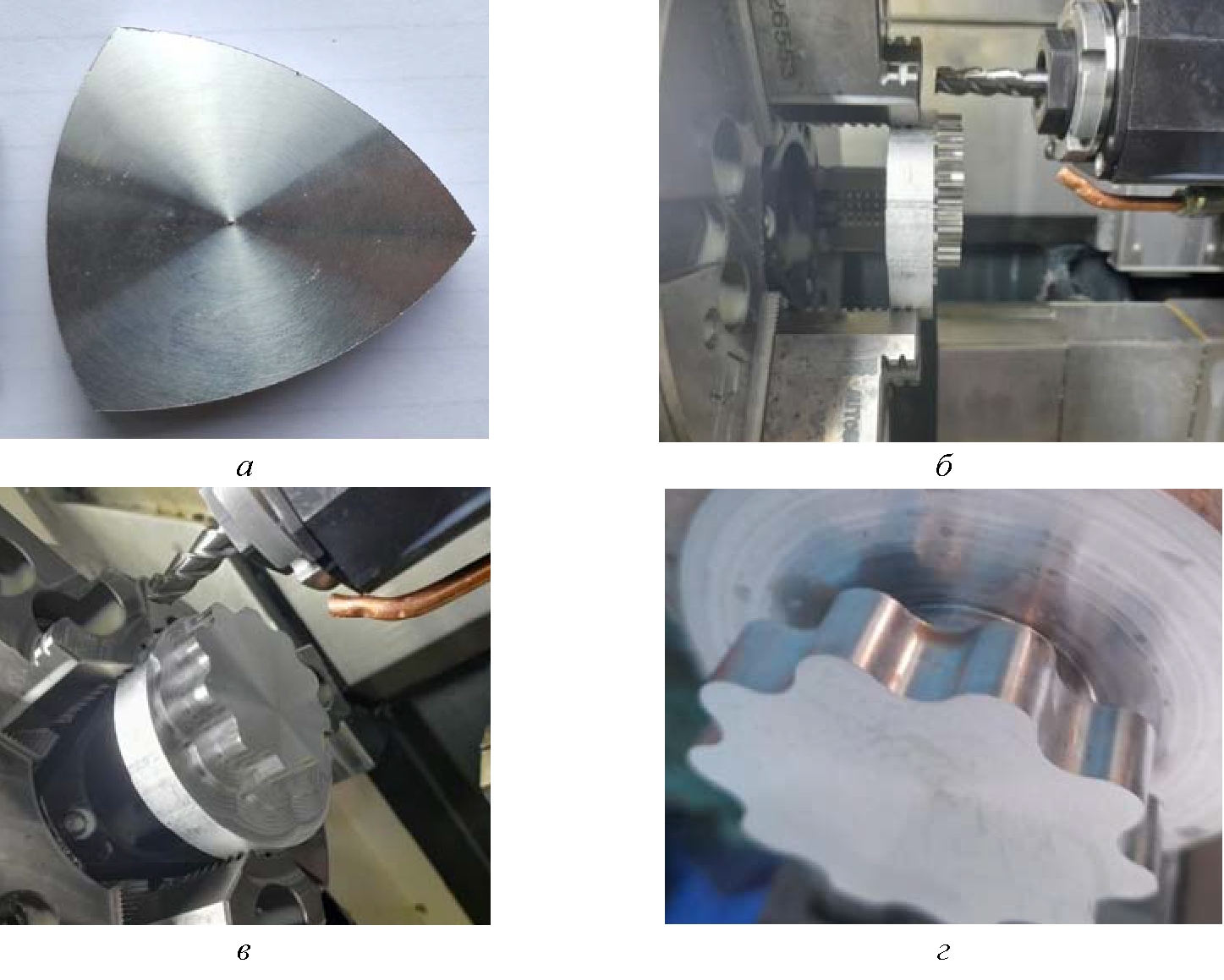 The assignment of cutting parameters during milling to obtain complex-contour equiaxed surfaces of aerospace products was carried out using control programs for CNC machines. As the main parameters for verifying the modeling results during experimental studies, the values of the accuracy of the dimensions and shape of equiaxed contours, the roughness of the surface machined by milling during the manufacture of real parts in production conditions were used. As a result, it was possible to produce parts in the form of an equiaxed contour profile (Reuleaux triangle) with high accuracy of dimensions, shape and the required quality of the surface layer (Fig. 9, a). The step-by-step processing when obtaining the contour of a part for the pin-gear drive is presented in Fig. 9, b–d.