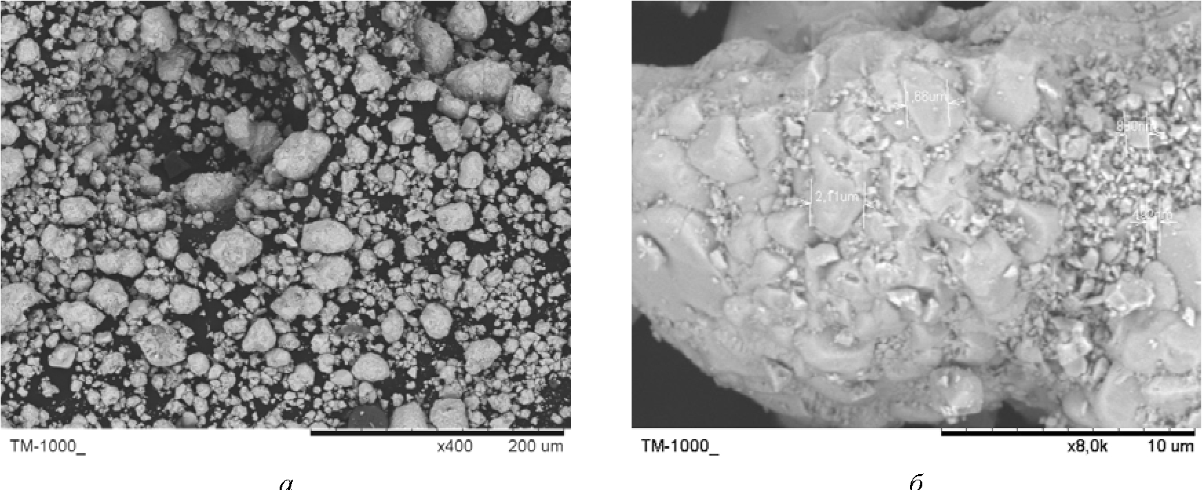 Рис. 10. Морфология алюминиевой стружки, полученной при фрезоточении: а – распределение по размерам, 400; б – наноструктурированный фрагмент стружки