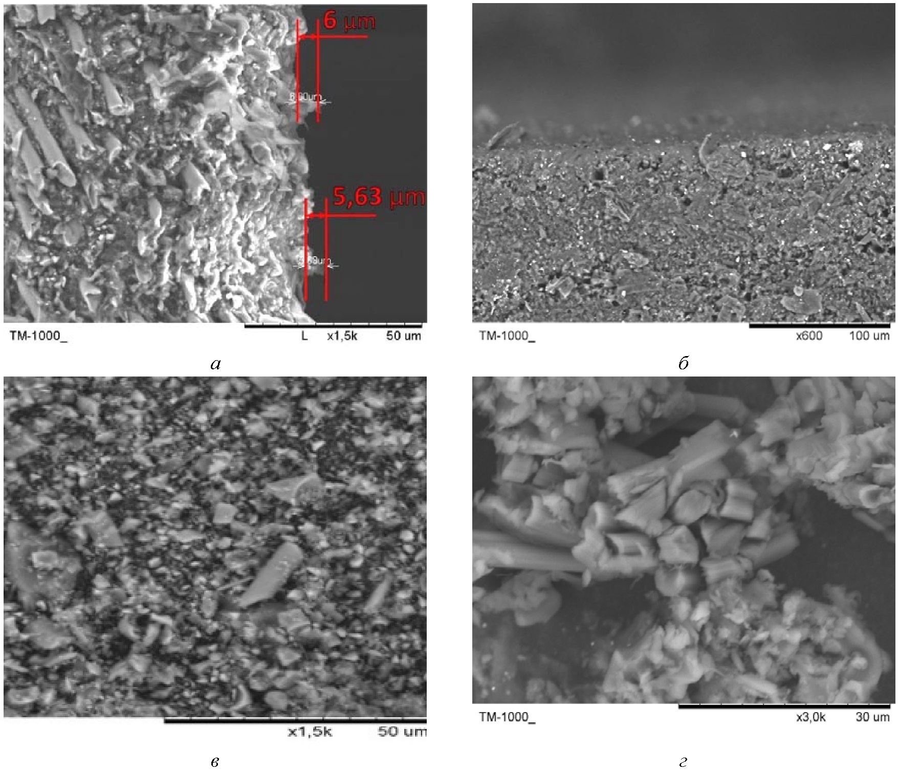 Рис. 12. Результаты электронно-микроскопического исследования: а – обработанная поверхность стеклопластика; б – обработанная поверхность углепластика; в – морфология стружки стеклопластика; г – морфология стружки углепластика