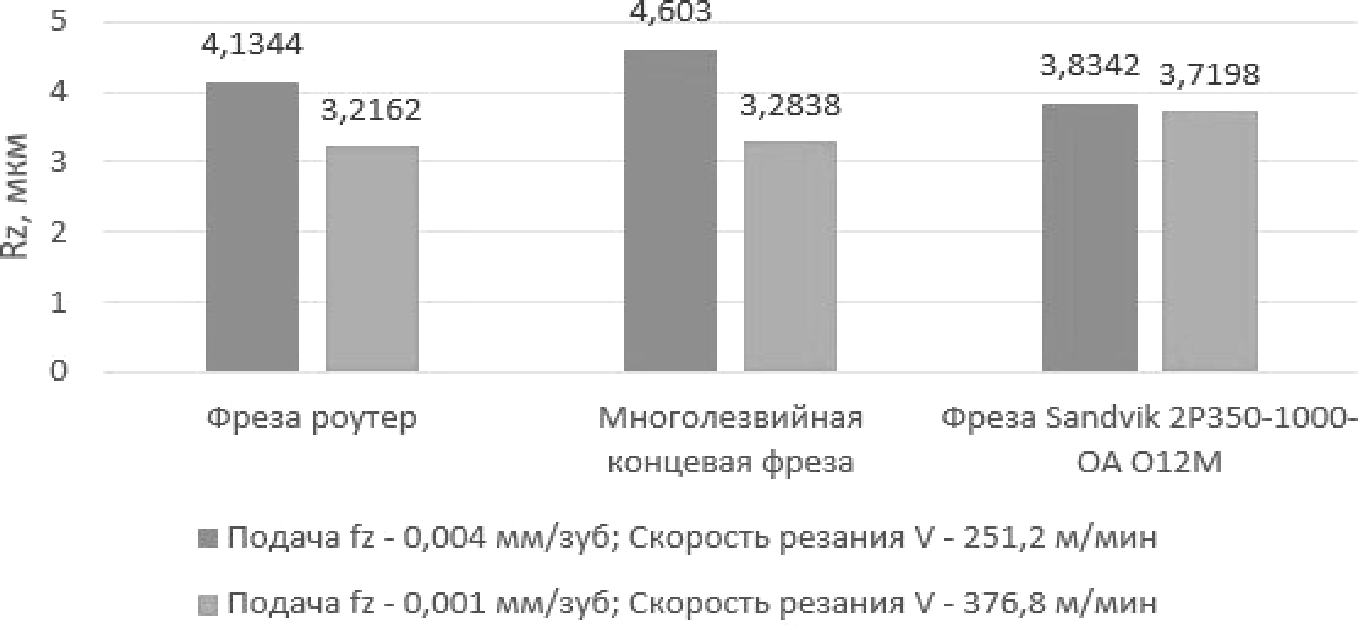 The use of high-speed processing of parts made of composite materials confirms the effectiveness of using new designs of multi-edge milling cutters (the quality of processing corresponds to the characteristics of the world's best analogues). As confirmation, the results of experimental studies are presented in the form of comparative diagrams of measuring the surface roughness of carbon fiber reinforced plastics according to the parameters Ra and Rz using different types of cutters (Fig. 13, 14).