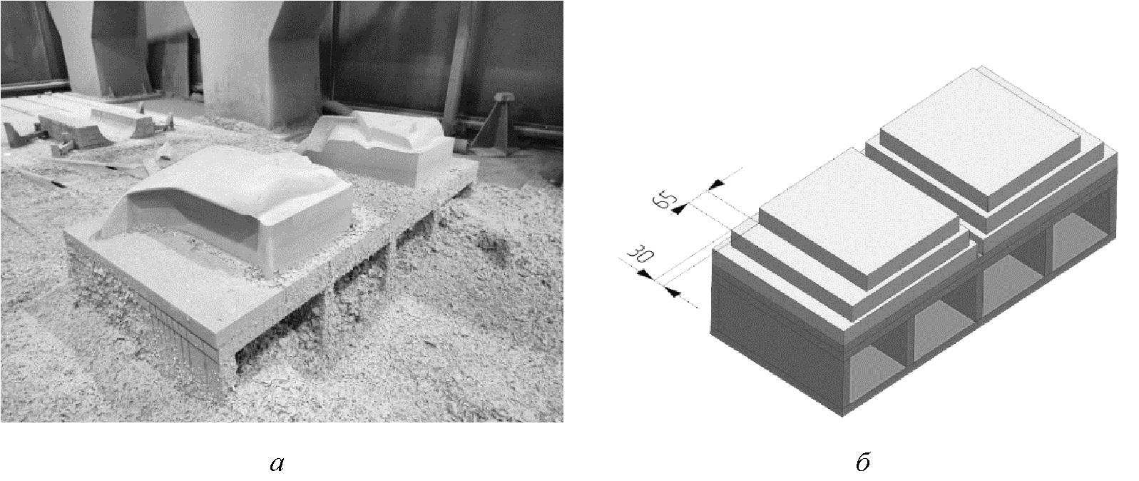 Рис. 2. Изготовление оснастки из модельного пластика: а – заготовка мастер-модели на станке с ЧПУ; б – заготовка для изготовления мастер-модели из модельного пластика на каркасе из МДФ