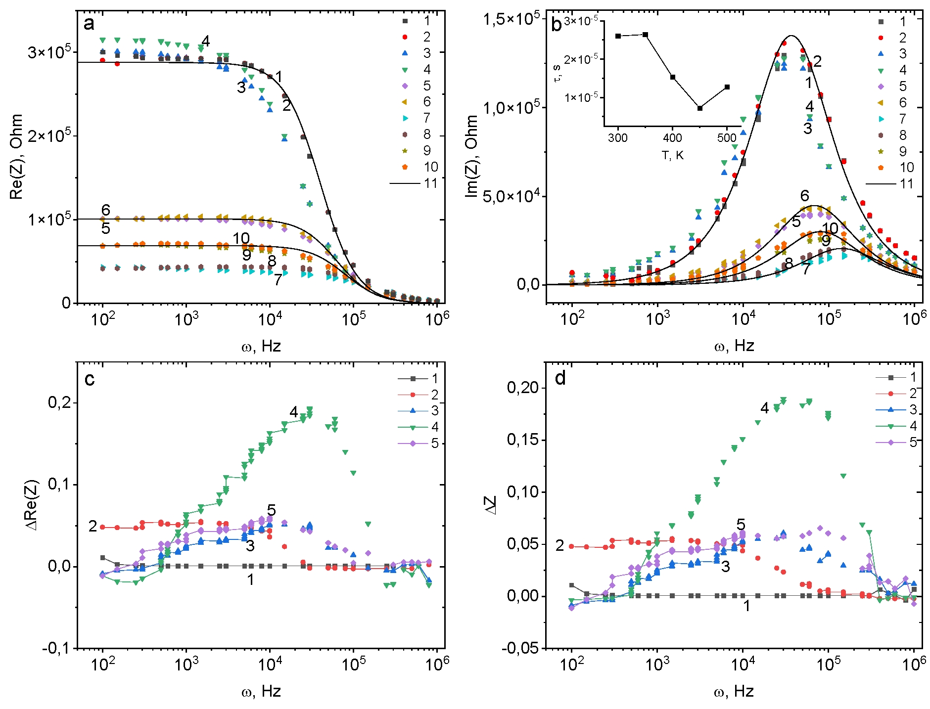 Impedance, active and reactive parts of the impedance were measured on an AM-3028 component analyzer in the frequency range ω = 102–106 Hz at temperatures of 77−500 K, the amplitude of the alternating voltage was 1 V. To calculate the impedance spectra, ZView software (Scribner Associates Inc.) was used.
