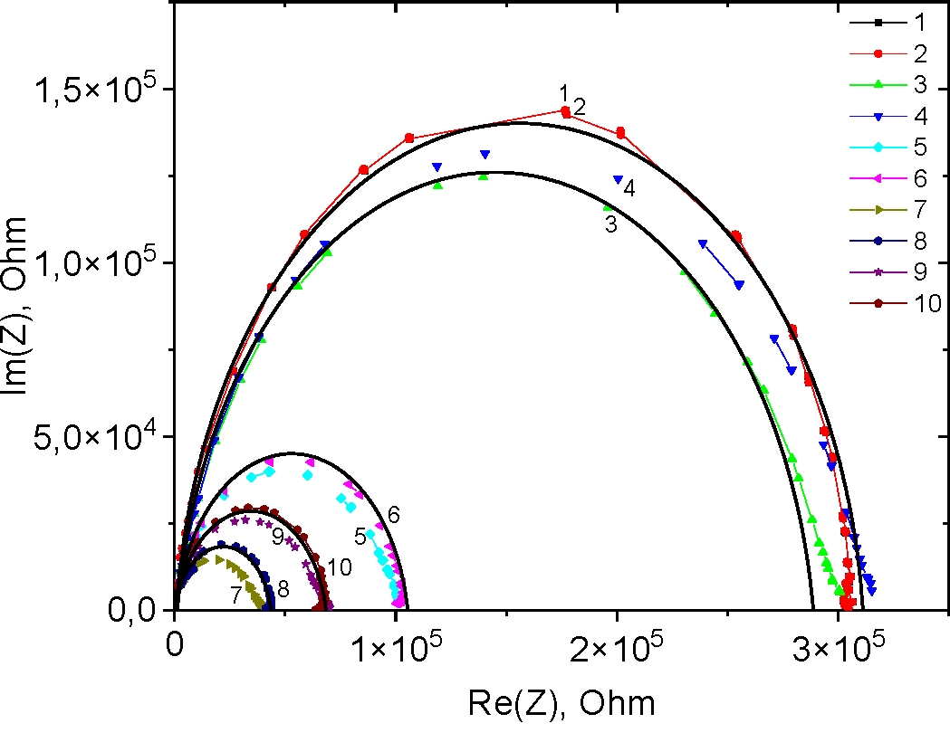 Рис. 2. Годографы импеданса для образца Mn0,9S в нулевом магнитном поле (1, 3, 5, 7, 9) и в магнитном поле H = 12 кЭ (2, 4, 6, 8, 10) при температурах T = 300 К (1, 2), 350 К (3, 4), 400 К (5, 6), 450 К (7, 8), 500 К (9, 10)